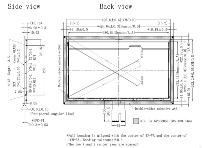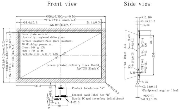 | LCD Size: | 495.6 X 292.2 X 10.57mm (w/o Touch) | LCD With Touch: | 526 X 324 X 15.16mm (with Touch) |