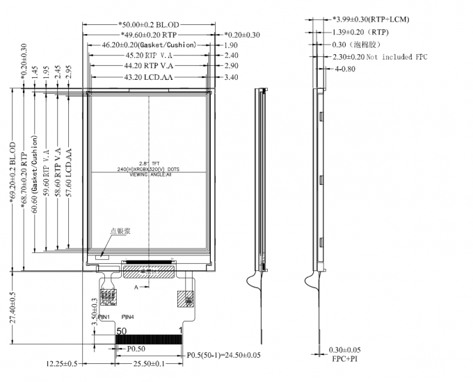 | Display area(AA) | 43.2(H) *57.6(V) (2.8inch ) | mm |
